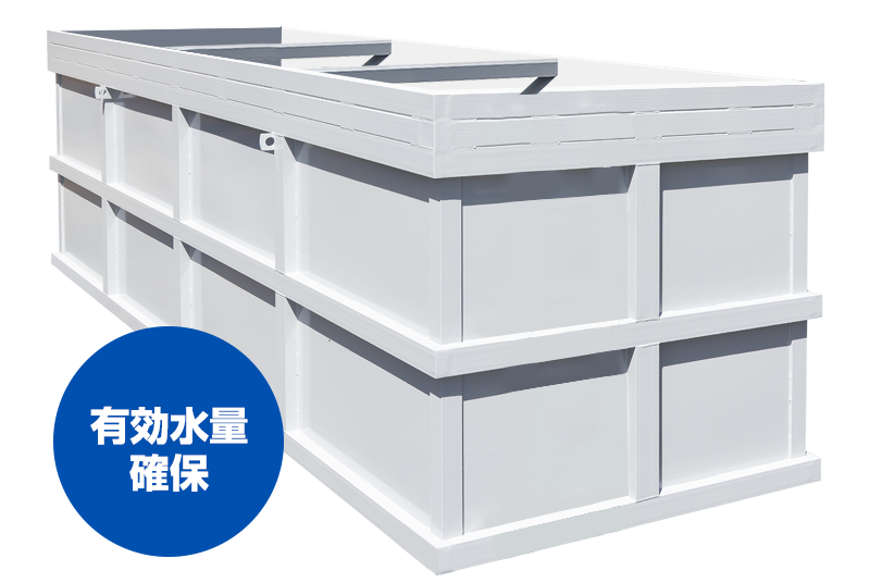 消火水槽としての有効水量(※)基準を満たした「置くだけ防火水槽」と、多目的水槽としてお使いいただける「置くだけ10㎥水槽」の2タイプをご用意しております。